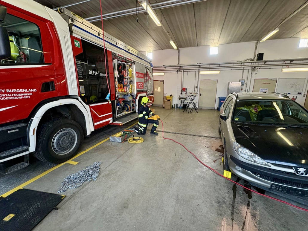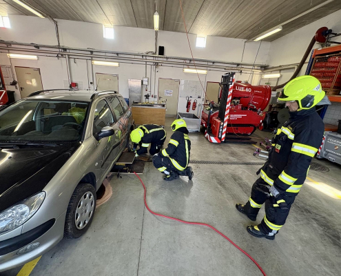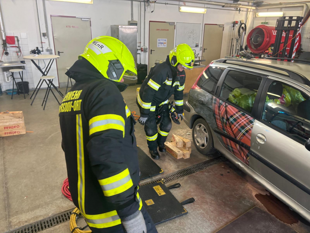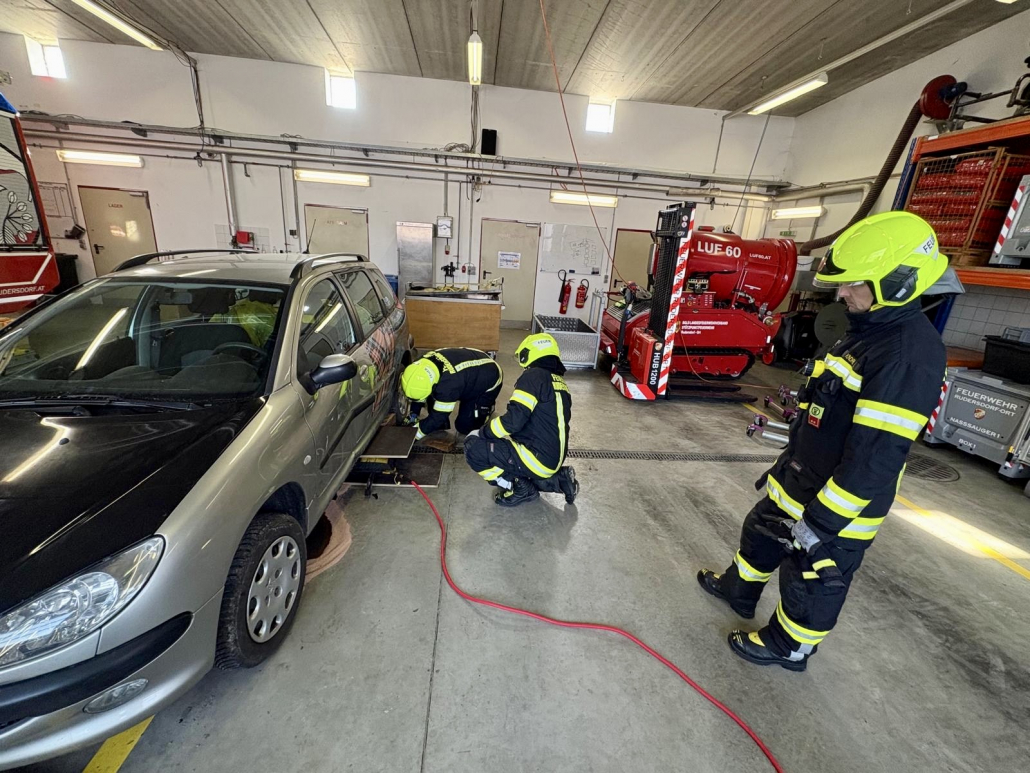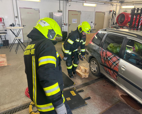 Zeitgleich fand am Vorplatz des Feuerwehrhauses die Station WLF-K statt. Unter der Aufsicht unseres Maschinisten OLM Deutsch Mario wurde das korrekte und sichere Anschlagen von Fahrzeugen mittels Hebetraverse sowie der dafür notwendigen Anschlagmittel geübt.